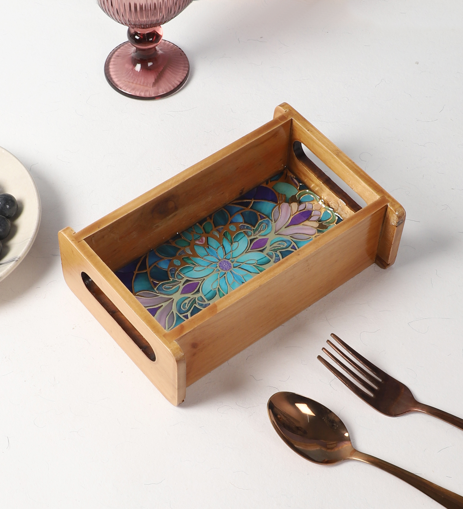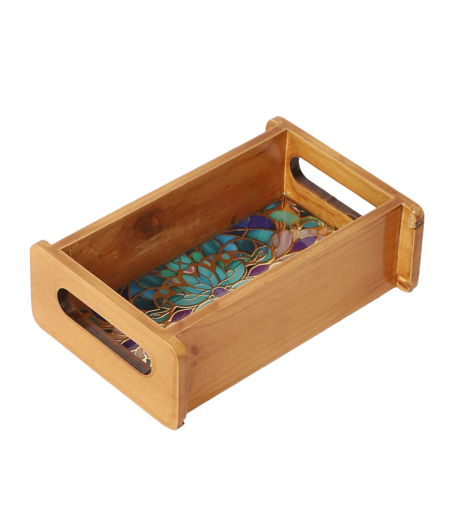 The Shree Jee decorative tray is meticulously crafted from natural pine wood and treated with a smooth, clear natural polish that enhances the grain while providing moisture resistance. A durable printed floral design is sealed under a layer of resin–enamel, creating a glossy, protective finish that highlights the artwork and makes cleaning effortless. Lightweight yet sturdy, the tray features raised edges and ergonomically cut side handles so it’s easy to carry anywhere—ideal for serving, decorating, or organizing items around the home. With its blend of rustic warmth, elegant design, and portable functionality, it makes a charming gift or stylish addition to your kitchen or living space.