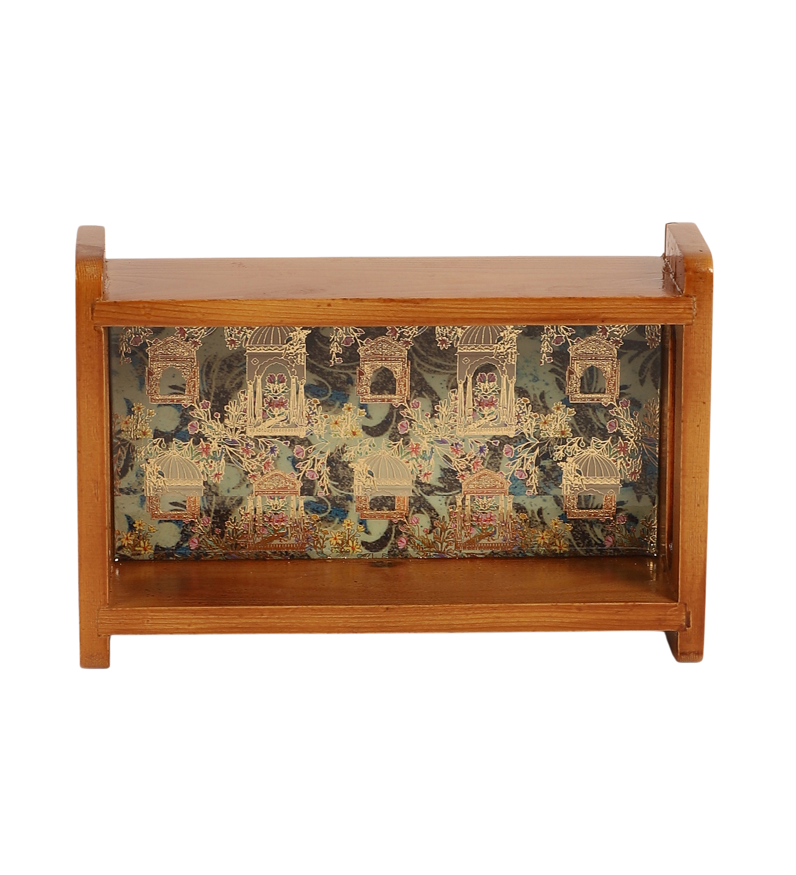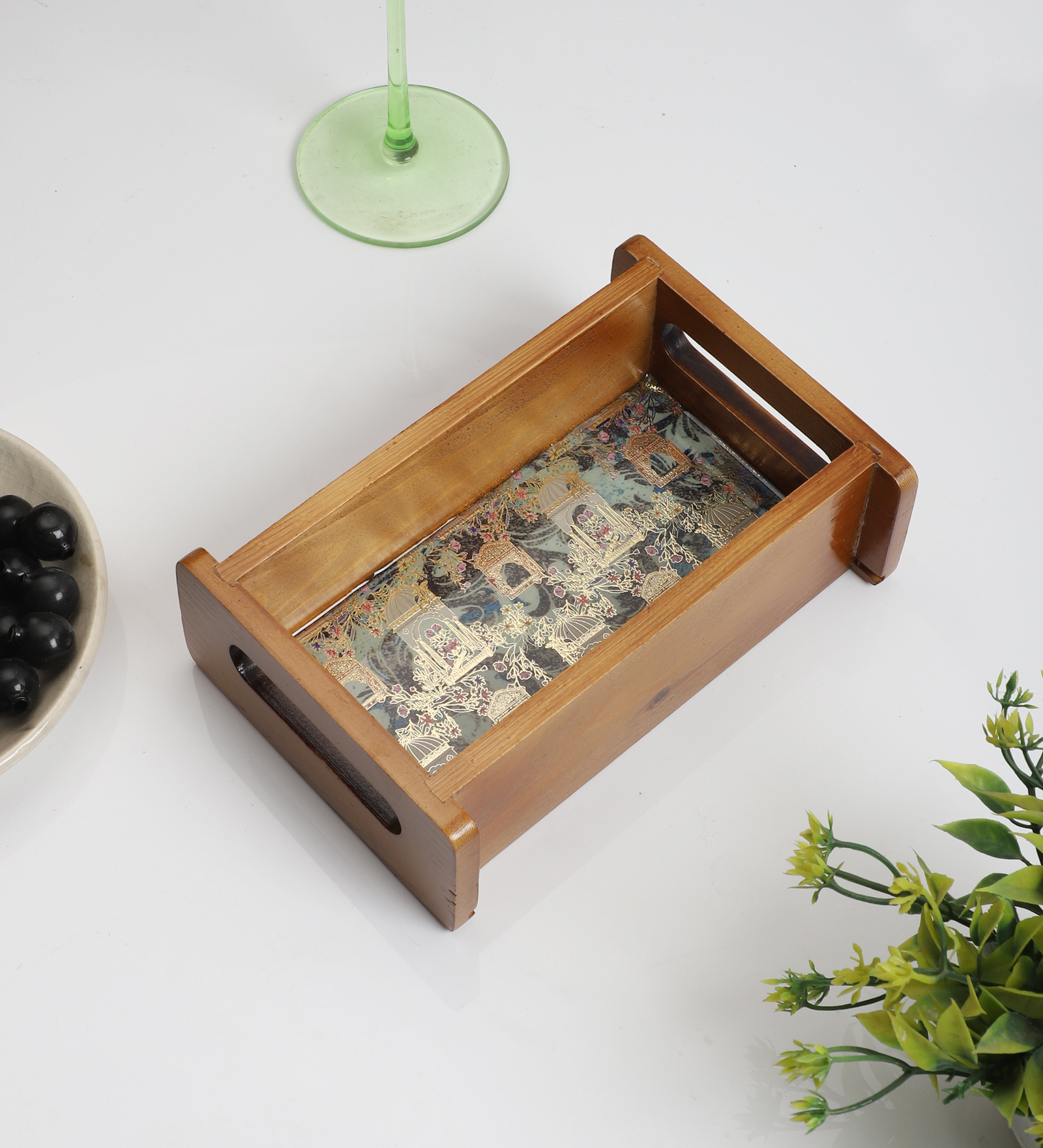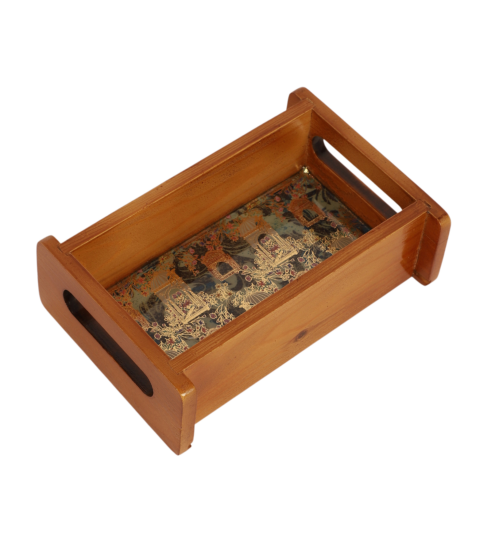 The Shree Jee decorative tray is meticulously crafted from natural pine wood and treated with a smooth, clear natural polish that enhances the grain while providing moisture resistance. A durable printed floral design is sealed under a layer of resin–enamel, creating a glossy, protective finish that highlights the artwork and makes cleaning effortless. Lightweight yet sturdy, the tray features raised edges and ergonomically cut side handles so it’s easy to carry anywhere—ideal for serving, decorating, or organizing items around the home. With its blend of rustic warmth, elegant design, and portable functionality, it makes a charming gift or stylish addition to your kitchen or living space.