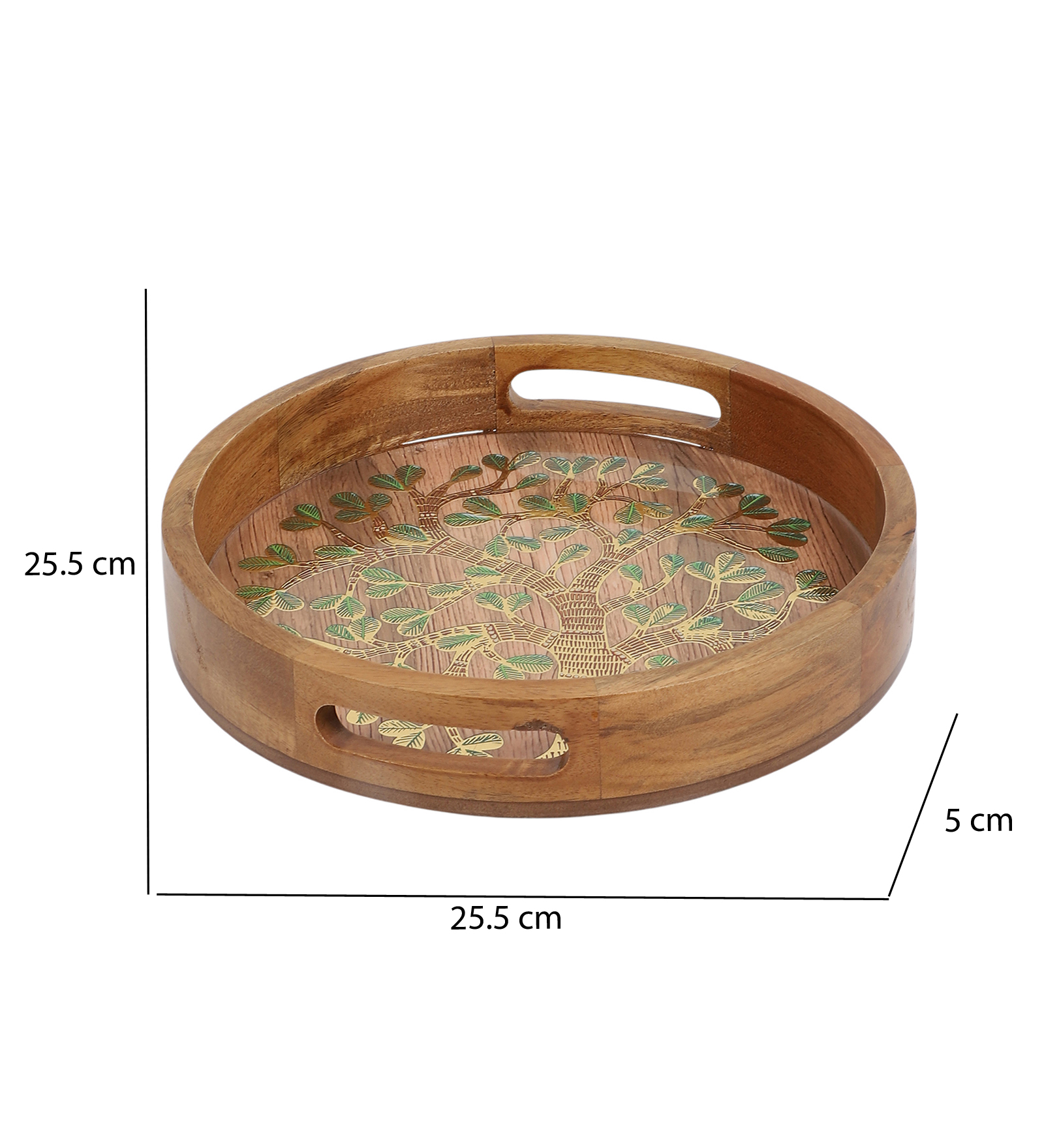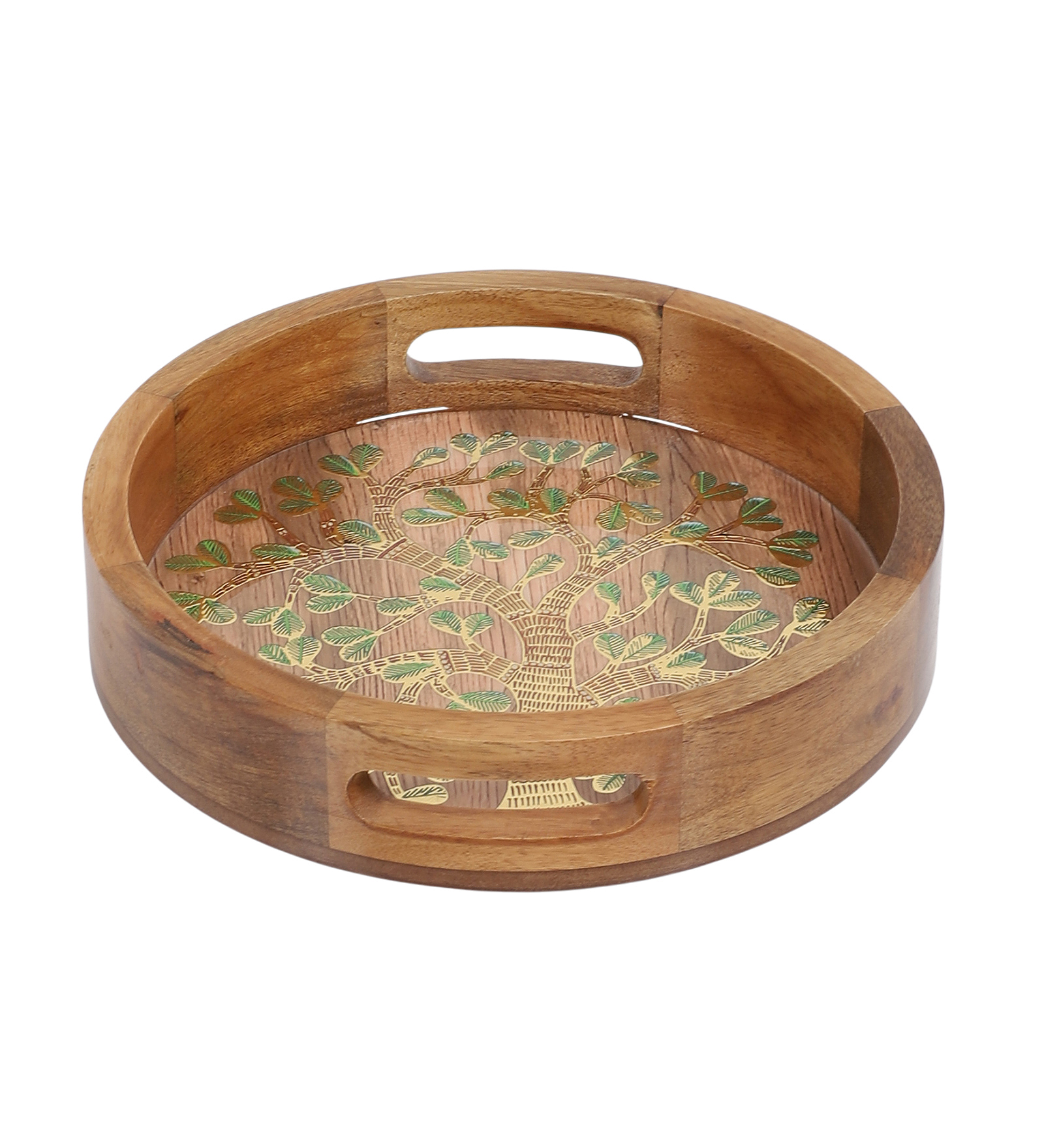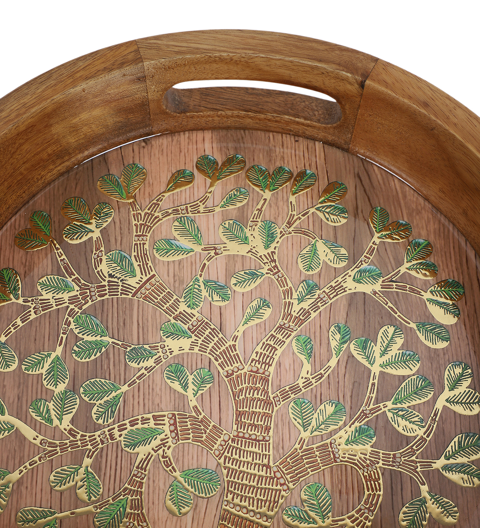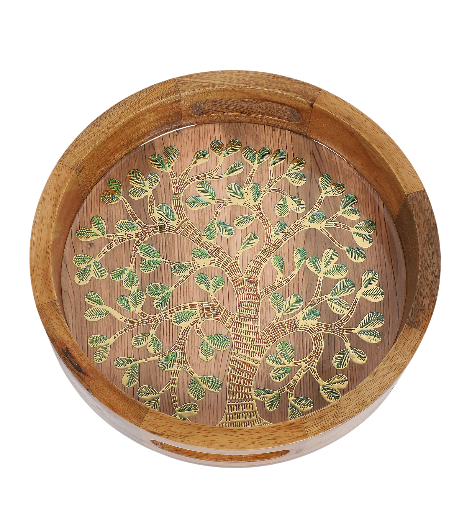 Round Wooden Tray with Resin-Embedded Tree of Life Design. Handcrafted from high-quality wood, this tray showcases a beautifully detailed gold and green tree motif, embedded beneath a smooth resin surface for a glossy and durable finish.