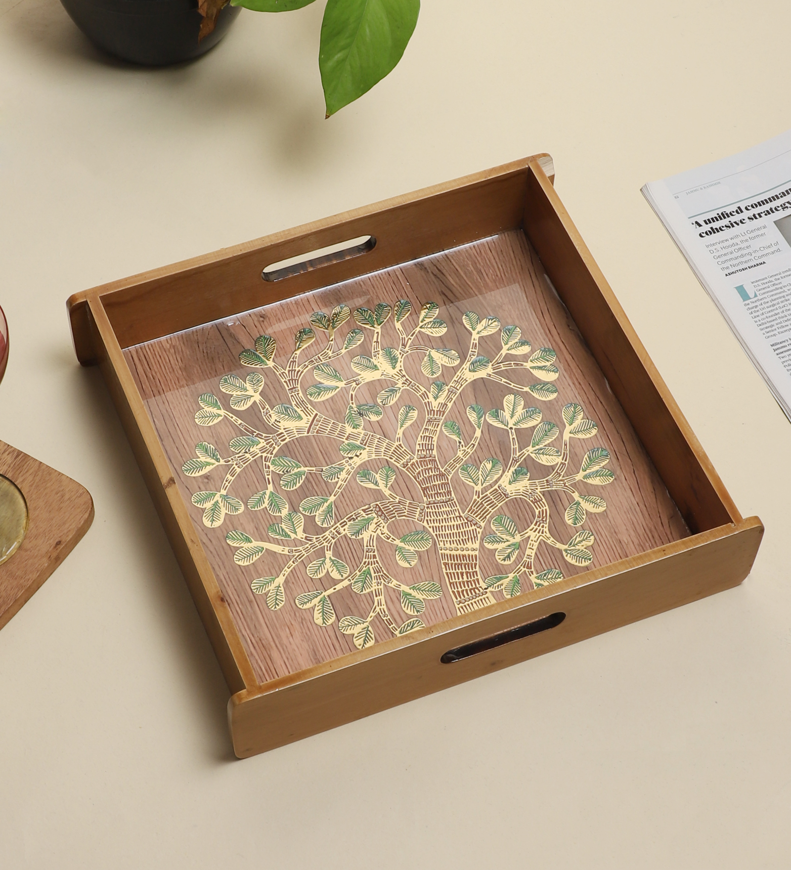 The Shree Jee elegance and charm to your serving experience with this handcrafted square wooden tray. Made from premium quality wood, each tray features a stunning resin-coated base with intricate printed artwork, ranging from traditional Indian motifs to contemporary patterns. The smooth finish and sturdy handles make it perfect for both daily use and special occasions.