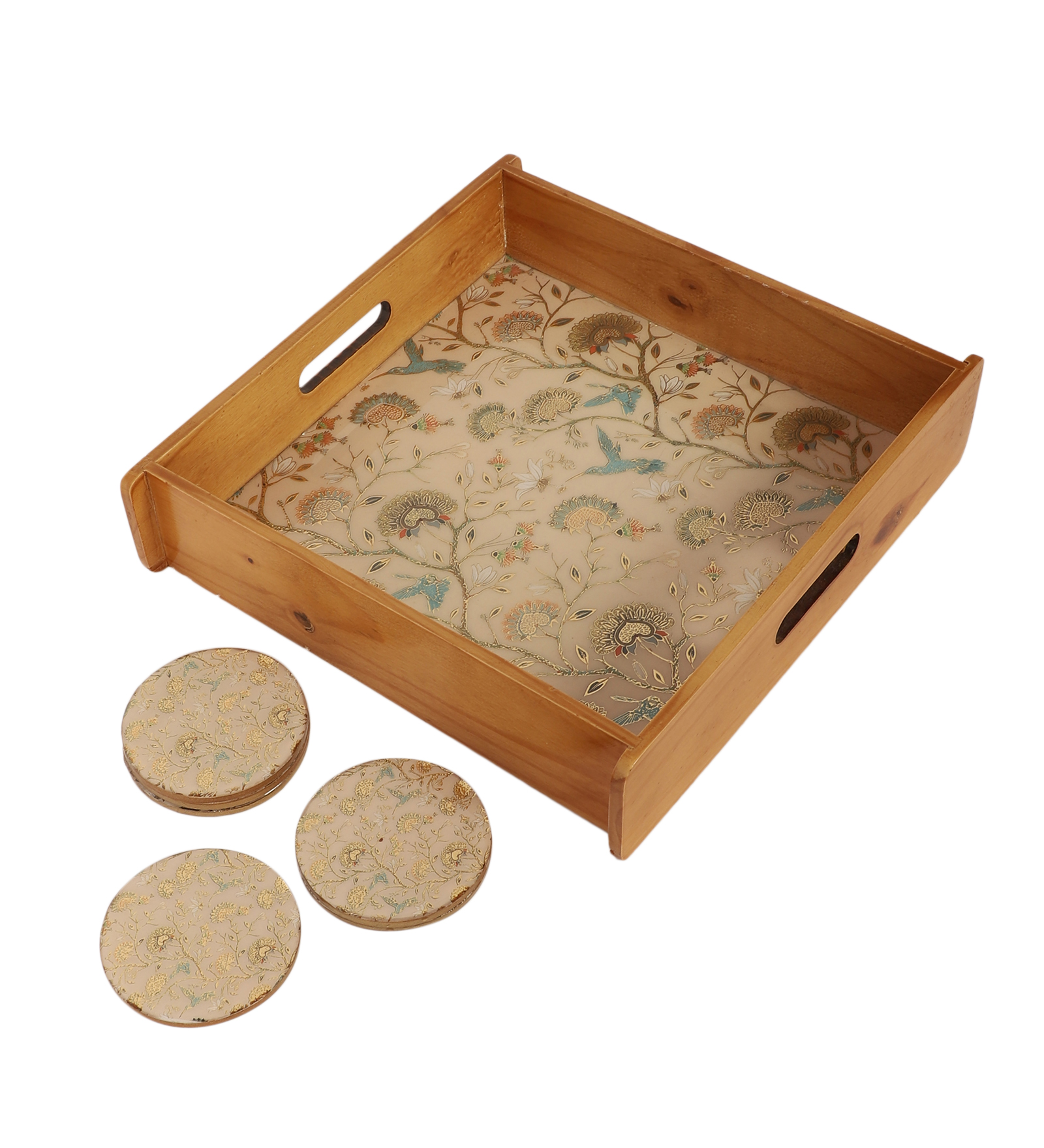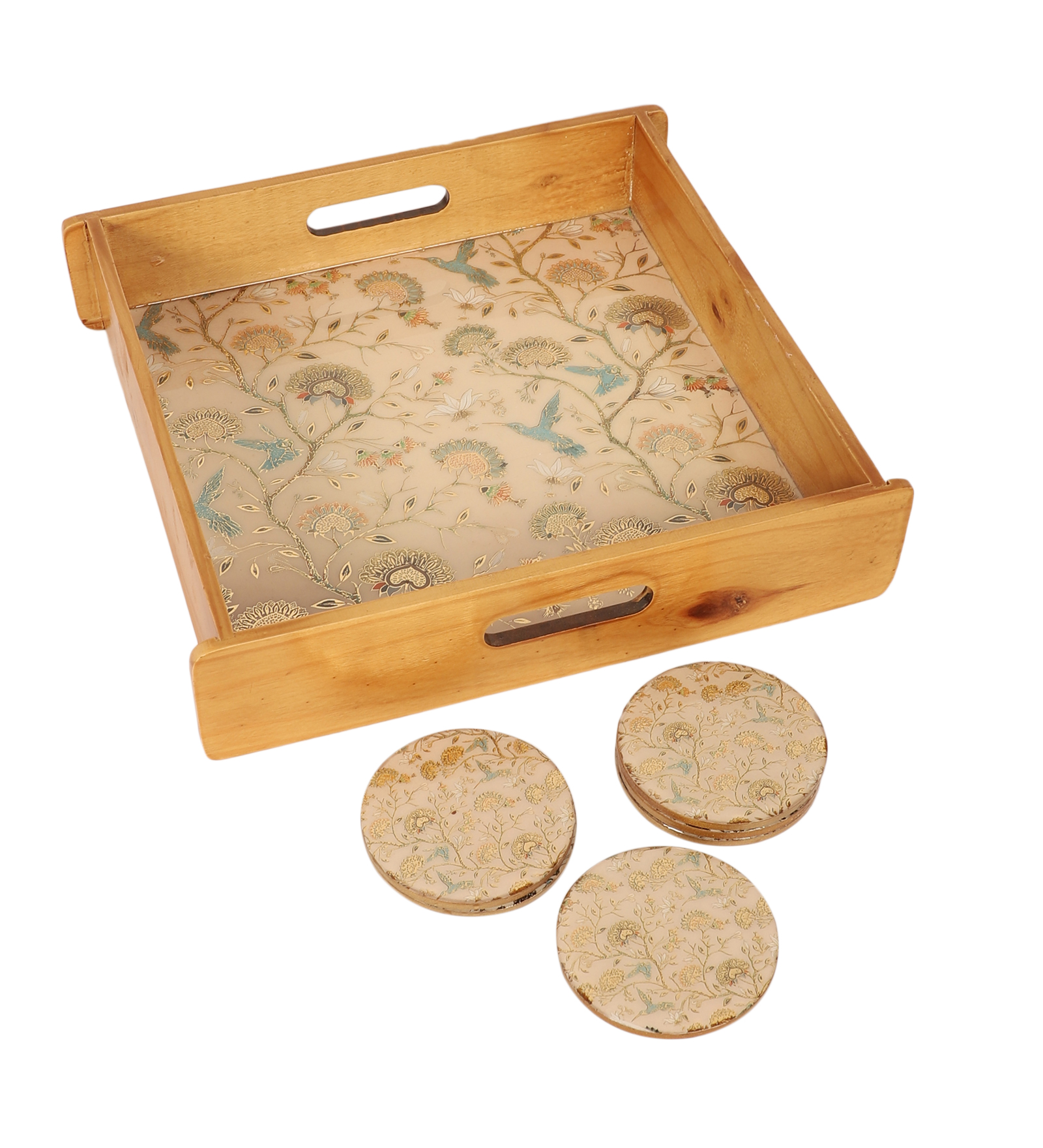 Grace your home with the delicate charm of nature through this wooden tray and coaster set, featuring soft floral patterns and graceful hummingbirds in flight. With a resin-coated base for durability and easy maintenance, this set adds an artistic, nature-inspired touch to your tea time or decor arrangement.